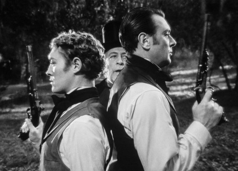 (1) Buck finds himself in a duel with Ted Dillard (Richard Cromwell) to defend Julie's honor. (2) Ted, younger brother to Pres, rebukes Julie. (3) Julie is stunned by the results of the duel. She realizes her pride and anger have pushed her too far.