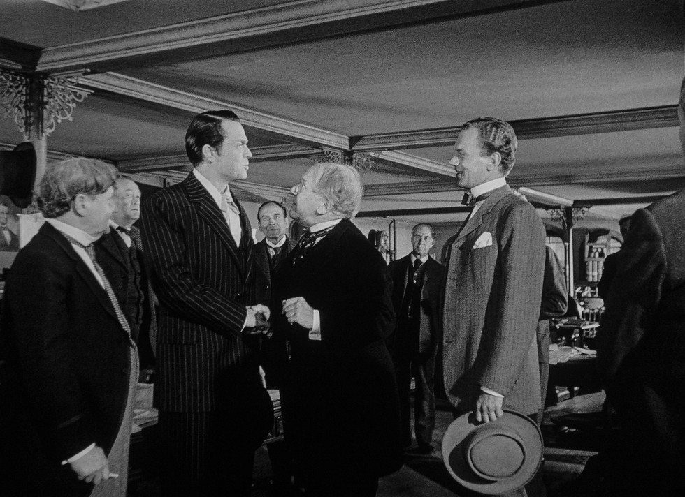 (1) The “News on the March” footage was narrated by actor William Alland. (2) Footage from Charles Foster Kane’s funeral. (3) Kane supports presidential candidate Theodore Roosevelt. (4) In 1900, Kane marries the U.S. President’s niece Emily Monroe Norton (Ruth Warrick). (5) Welles wasn’t afraid to put his actors in the shadows, as studio executives critic the newsreel footage.