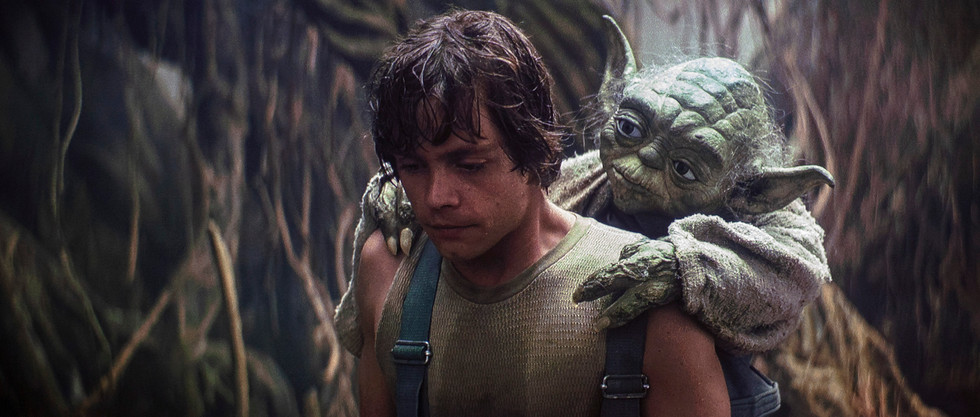 (1) After Rebel forces abandon Hoth, Luke flies his X-wing starfighter to the marshy planet Dagobah in search of a Jedi Master named Yoda. (2 & 3) While Princess Leia makes repairs on the Falcon, Han grabs her hand. She quickly calls him a Scoundrel. "Scoundrel? he says. "I like the sound of that." Leia says, "Stop that. My hands are dirty." He responds, "My hands are dirty, too. What are you afraid of? "Afraid?" she says. "You're trembling," says Han. (4) Luke starts his training with Yoda. (5 & 6) With Han at the controls, the Millennium Falcon races toward the Cloud City.