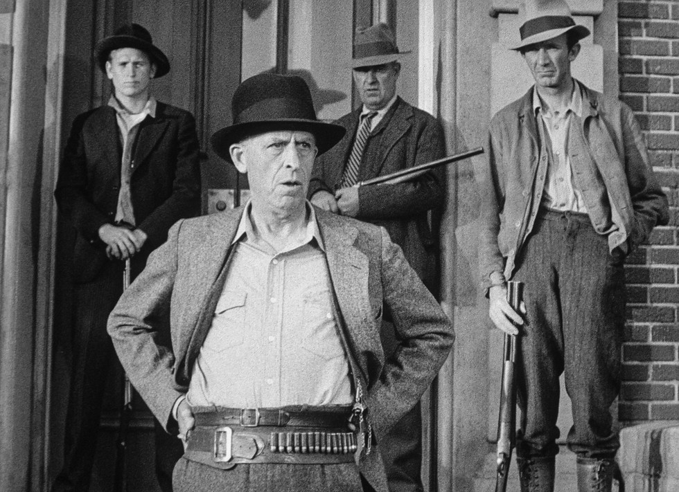 (1&2) Town gossips learn about the arrest and assume Joe is one of the four suspects in the kidnapping of Helen Peabody. (3&4) A mob shows up in front of the jail as Sheriff Hummel (Edward Ellis) and his men watch guard.