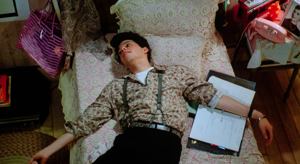 (1&2) Andie tells her dad she's in love and accepted Blane's invitation to the prom. (3&4) Andie's co-worker Iona (Annie Potts), overdoses on nostalgia in her 1960s prom dress as they slow dance before giving Andie the dress. (5) Duckie all alone.