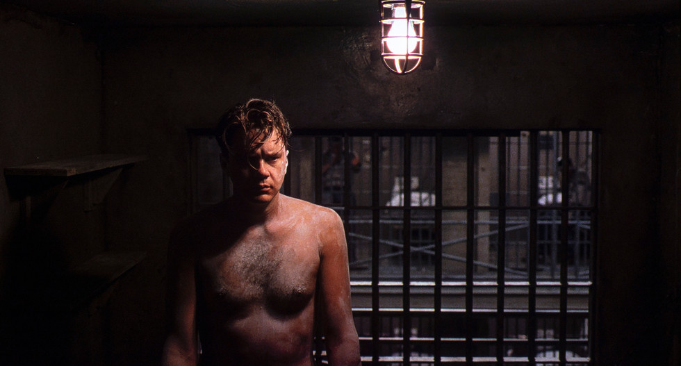 (1) Brutally hosed down and treated for lice, Dufresne enters his prison cell. (2) After lights-out, new prisoner “Fat Ass” (Frank Medrano) cries out, “I don’t belong here! I want to go home! I want my mother!” (3) Heywood (William Sadler) wins the bet - a pack of cigarettes. (4) Captain Hadley (Clancy Brown) drags Fat Ass out of his cell and beats him severely. Vicious and corrupt, Hadley is the warden’s second-in-command.