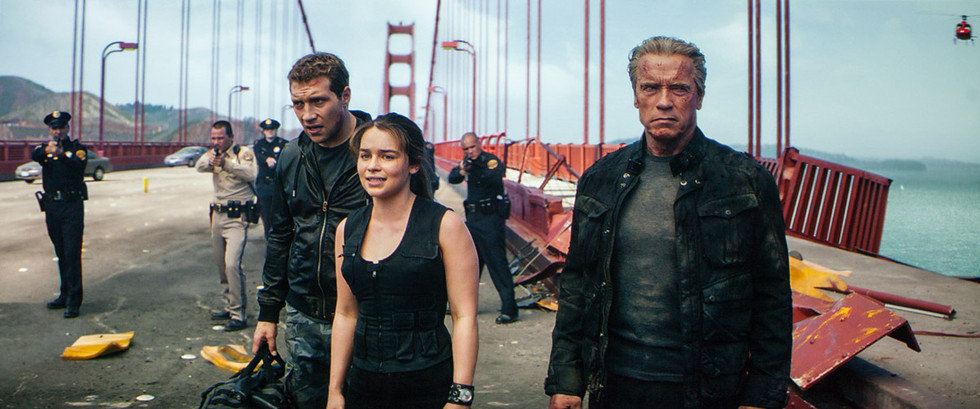 (1) John Connor (Australian actor Jason Clarke), and Kyle Reese (Australian Jai Courtney) discover Skynet's time travel machine. (2) Reese is sent back to 1984 via time-travel technology to rescue Sarah from assassination via Terminator. (3) Arnold Schwarzenegger is back for the fifth installment of the "Terminator" franchise. (4) A tougher Sarah Connor, played by British actress Emilia Clarke.