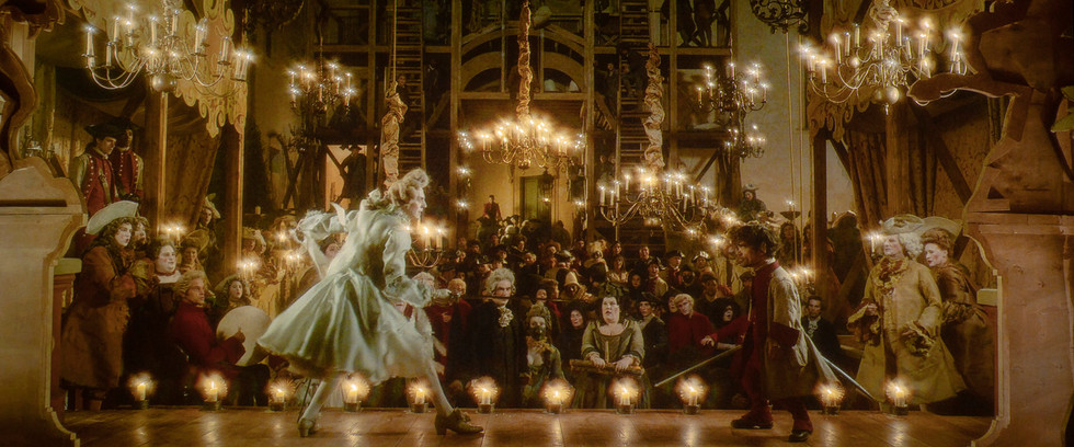 Filmed in Italy, the visuals have a painterly quality reminiscent of classic fairytale illustrators Arthur Rackham and Edmund Dulac. Save for the frosty blue, pre-battle camp sequence with its bedraggled soldiers filmed at Mount Etna, Sicily, most scenes have a warm and dreamy peach-toned intensity. Even so, no detail is lost on costumes or sets, and complexions are realistic. The opening sequence takes place in a theater in which Cyrano proves himself a masterful critic of the arts. It introduces all the main characters, and the play’s fatal consequence – pride.