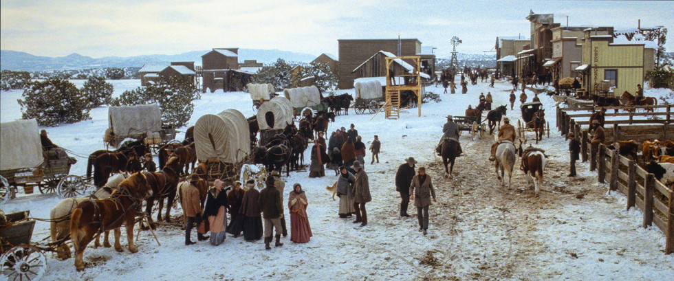 A construction crew of 140 built 40 buildings, working many days below freezing temperatures, to create the look of the 1880s frontier town of Silverado. Nearby Ten Rocks, Ghost Ranch, and Pecos River provided the terrain for the panoramic grandeur from cinematographer John Bailey (“In the Line of Fire,” “Ordinary People”), who was inspired by the New Mexico paintings from American modernist artist Georgia O’Keeffe.