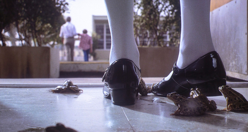 (1) The hillside overlooking Elliott’s suburban neighborhood. (2) Elliott and E.T. are now linked mentally and he becomes drunk when E.T. drinks some beer. (3&4) E.T. orchestrates Elliott’s moves to mimic a scene from “The Quiet Man” when John Wayne and Maureen O’Hara kiss. (5) Elliott releases the frogs before the students dissected the amphibians.