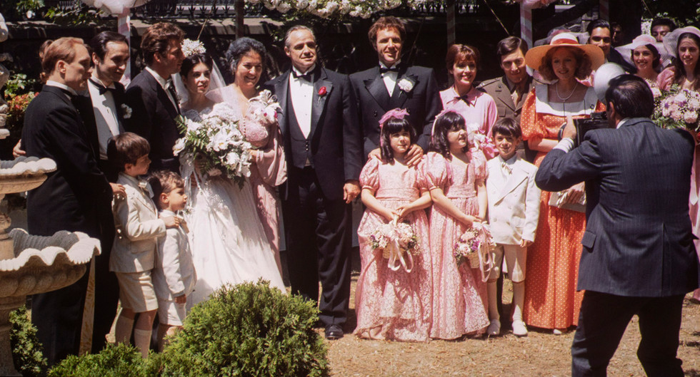 Marlon Brando as the Godfather, Don Vito Corleone, and Al Pacino plays his son Michael. The Corleone family gathers for a portrait during the wedding of Connie Corleone at their New York compound.